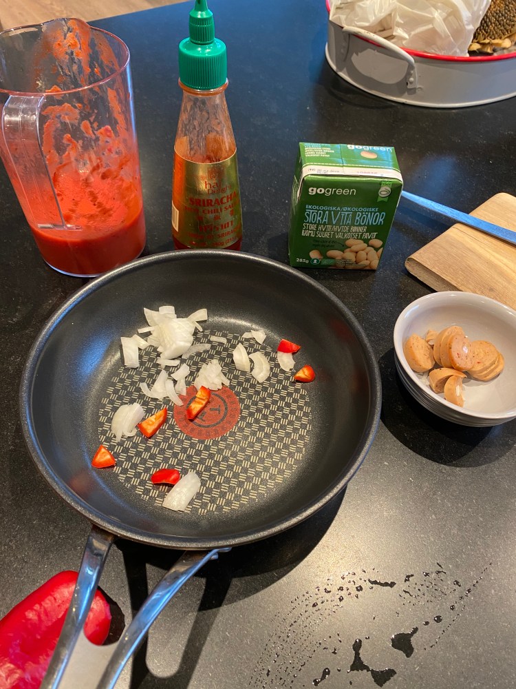 Fres løk og hvitløk til det blir mykt. Tilsett paprika, tomat og pølser og la det bli varmt. Tilsett tomatsaus, bønner og siracha. Det skal putre litt. Kakk i egget og la det simre inntill det hvite har blitt stivt, men plommen skal fremdeles være rennende.