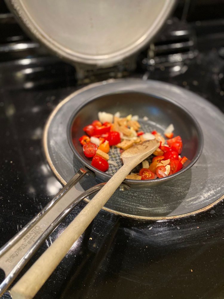 Jeg vet at jeg har igjen litt pizzasaus i et desilitermål fra i går. Det ligger litt oppskåret løk. Et litt inntørket fedd hvitløk ligger i løkkurven, noen slitne tomater i en beholder, og faktisk to paprikaer som begge er skåret i. Dette må bli brukt, og det er duket for Schackshuk.