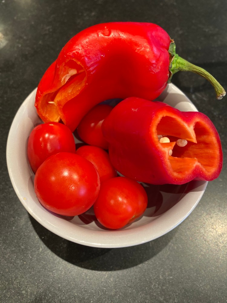 Etter å ha brukt de triste tomatene og skåret av det vasne på paprikaen, danderte jeg dette i en skål og satte frem på benken. Så satser jeg på at sultne munner i heimen spiser opp innholdet i skåla i løpet av ettermiddagen. Nå ser det nemlig friskt og godt ut. Et godt restetips!