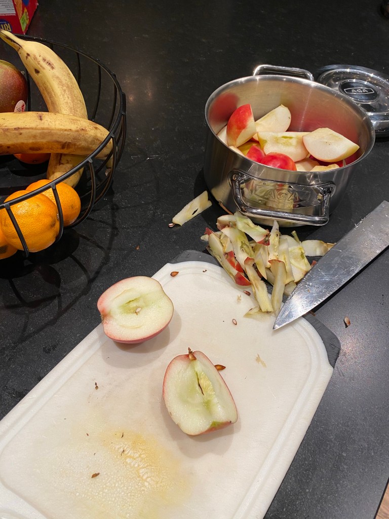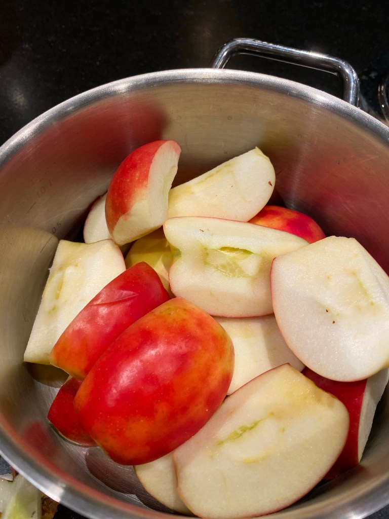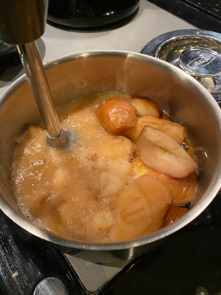 Verdens enkleste oppskrift – jeg lover! Kutt opp de eplene du har, med skall og ha i en gryte. Ha i 1ss vann for hvert eple. Sett over varme. Jeg satte mine inn i agaen, i simmering oven. Der stod det i noen. Timer. Da jeg tok dem ut var eplene møre, og stavmikseren ble plukket frem. Litt buzzing og miksing, så var mosen klar. Disse eplene var såpass syrlige at jeg tilsatte 2ss sukker til slutt. Det er ikke alltid nødvendig. Kosen ble så lagt over i bokser og videre til fryseren. Nå er det klart for vinterens tilslørte bondepiker, og smoothier gjennom vinteren.