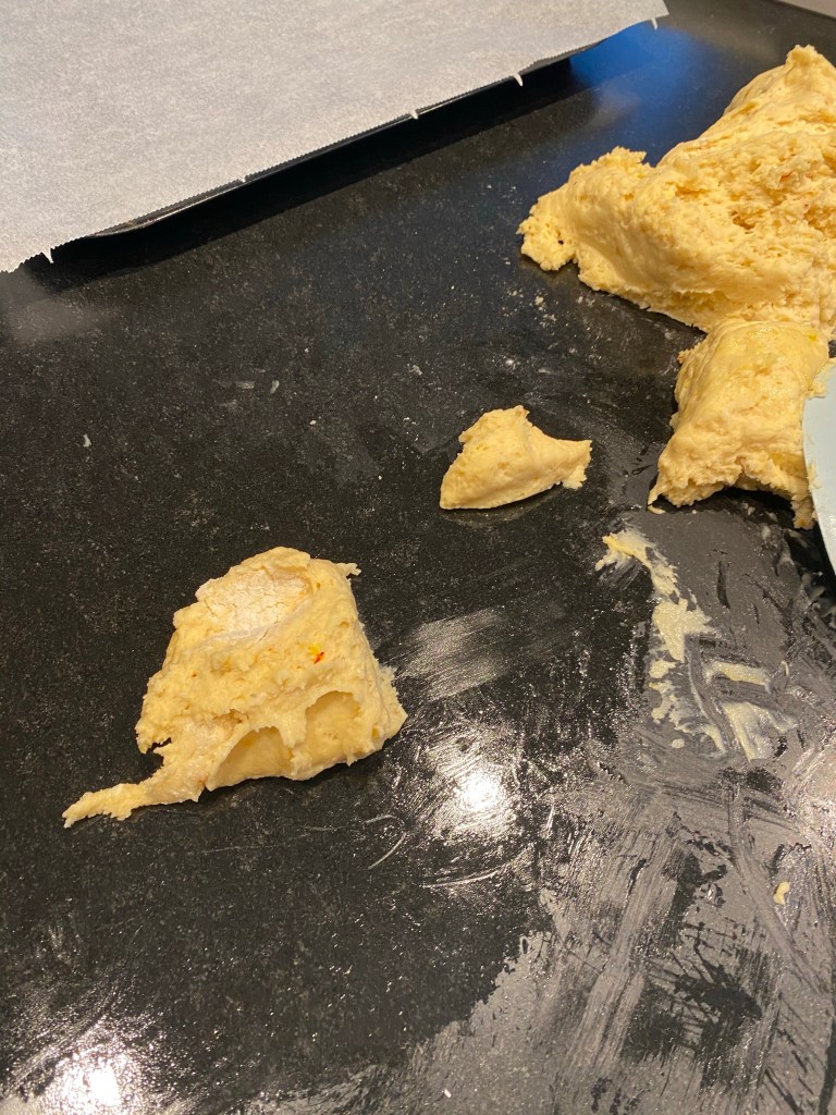 - Utbaking: ta litt olje på bakeplaten og olje på hendene. Bruk gjerne engangshansker også. Det gjør at det er enkletere å forme den glutenfrie deigen. Deigen skal være nokså løs, men formbar og rullbar.