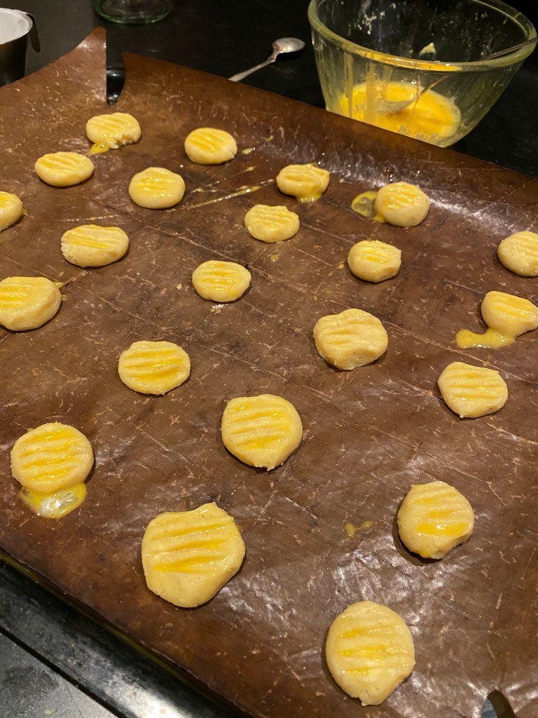 • Visp sammen egg med gaffel, bruk gaffelen med egg på til å presse kakene lett ned.