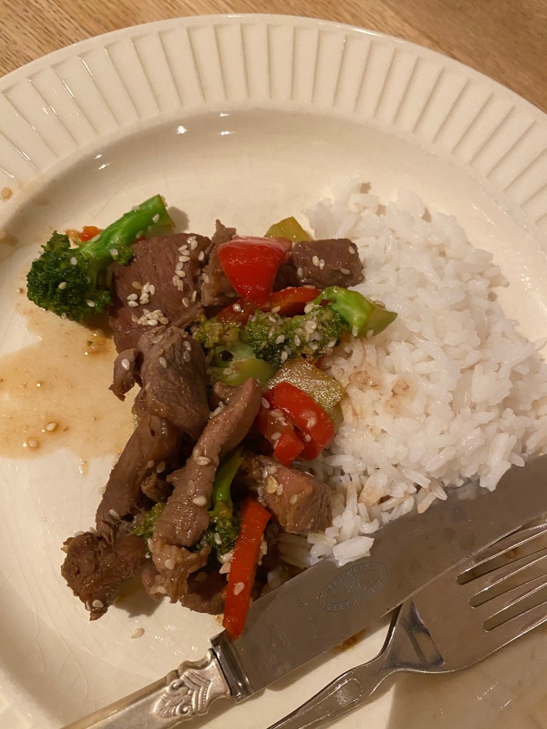 Brun kjøttet på middels varme. Hell også i marinaden. Når kjøttet er gjennomstekt har du i paprika og brokkoli. Fres det raskt sammen med kjøttet. Et par-tre minutter holder (en smakssak for så vidt, men både brokkoli og paprika er best når det får beholde noe tyggemotstand). Hell og strø over sesamfrø og sesamolje før servering.