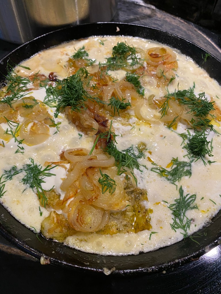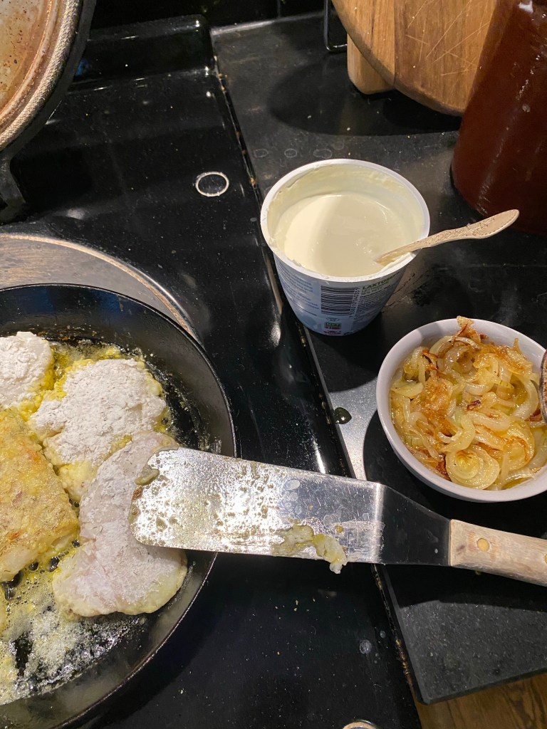 Ha stekt løk over fisken og klipp gjerne over friske urter. Server med kokte poteter og råkostsalat.